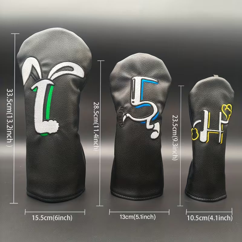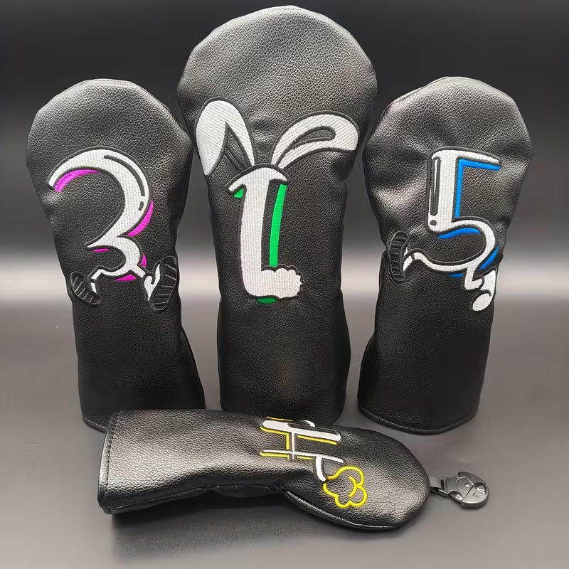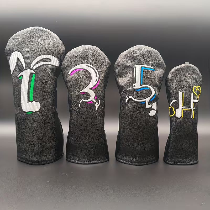 Inject some personality into your golf game with this "Cartoon Walker" Golf Headcover Set. Departing from traditional designs, these covers feature large, playful embroidered numbers characterized by cartoon "legs" and sneakers, bringing your clubs to life. The Driver cover sports a unique "Bunny Ear" design on the number 1, while the fairway woods and hybrid covers feature dynamic "walking" characters with distinct color accents. Crafted from durable, textured black PU leather, this set offers robust protection and a guaranteed conversation starter on the tee box.