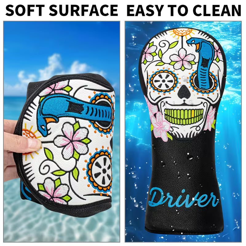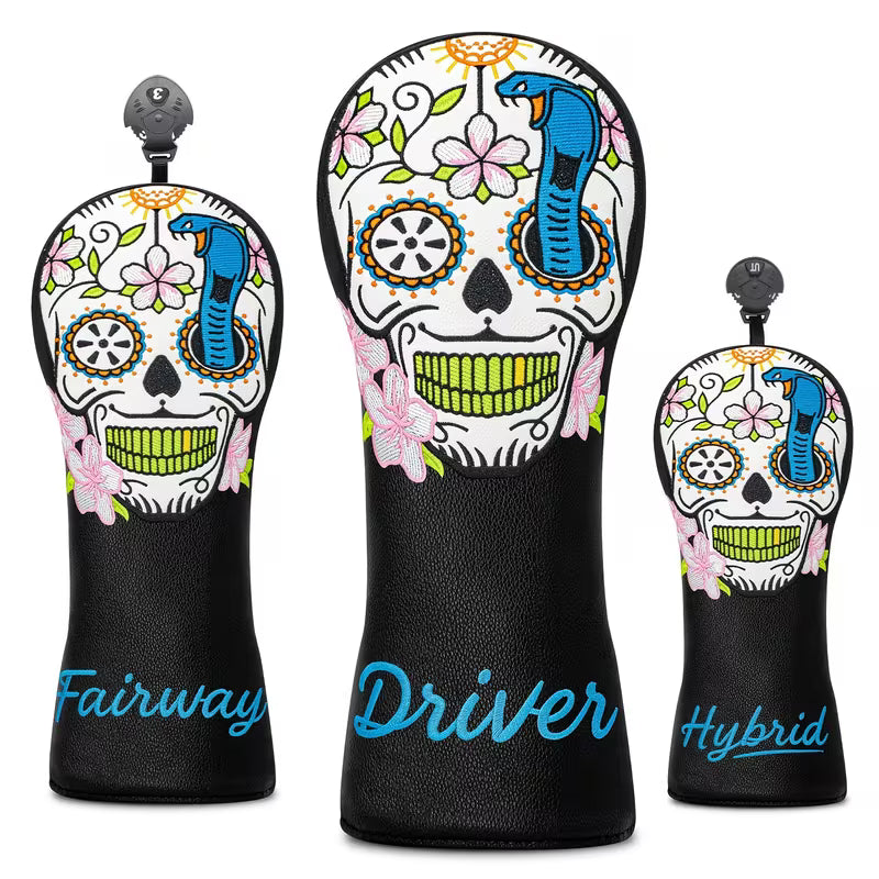 Inject some edge and artistry into your golf game with this "Sugar Skull & Cobra" Golf Headcover. This striking design features a large, detailed "Day of the Dead" sugar skull embroidered on a white background, distinctively accented with a blue cobra snake emerging from one eye socket and surrounded by pink cherry blossoms. The lower section is crafted from durable black PU leather and features bold, cursive teal embroidery explicitly identifying the club type ("Driver", "Fairway", or "Hybrid"). Designed primarily for right-handed bag setups to display the text perfectly, this cover offers both high-impact style and premium protection.